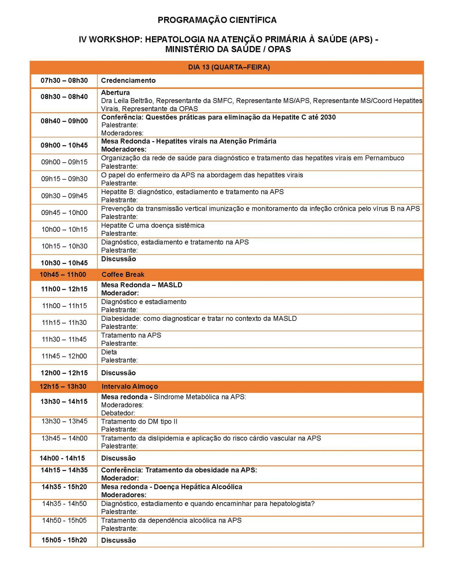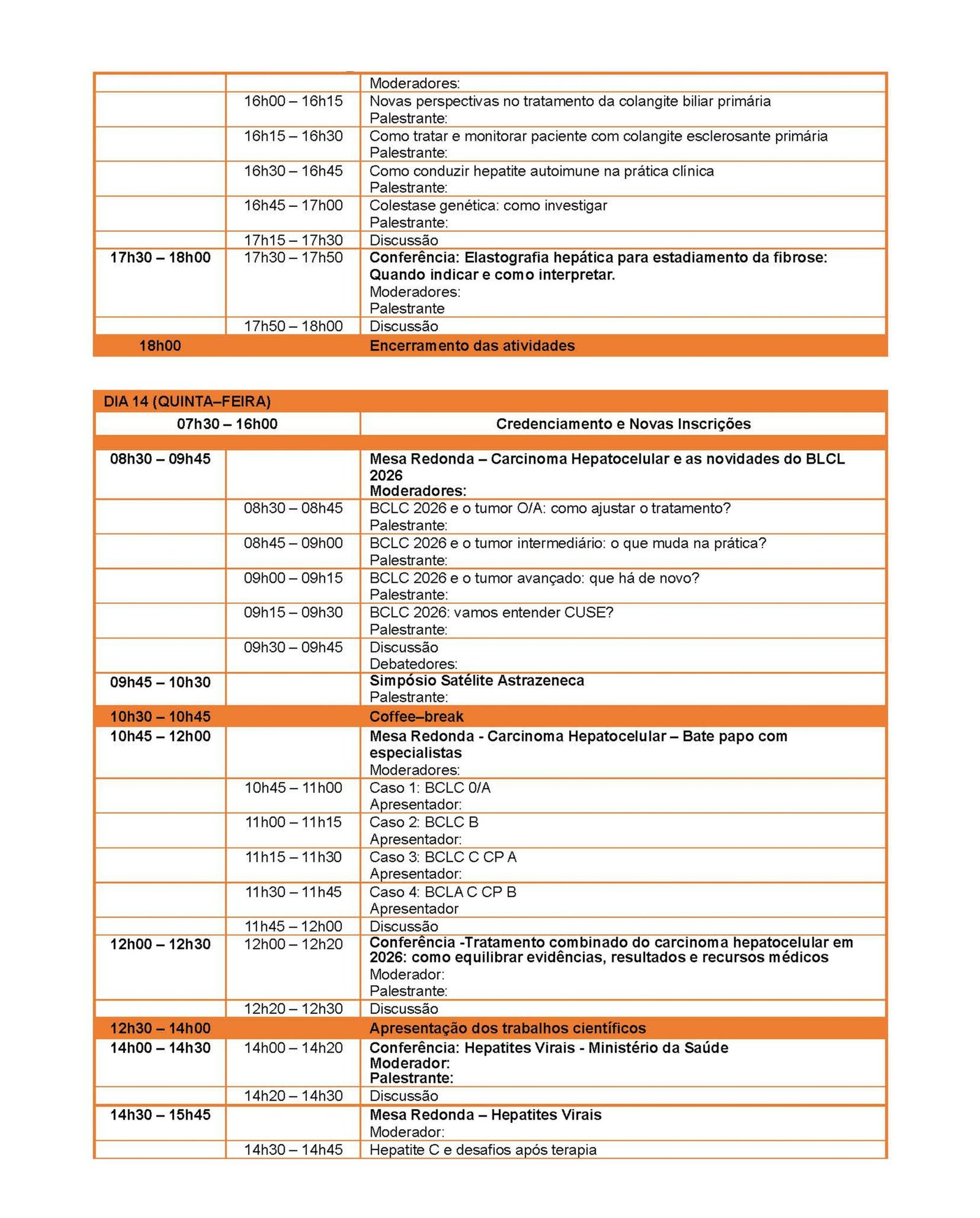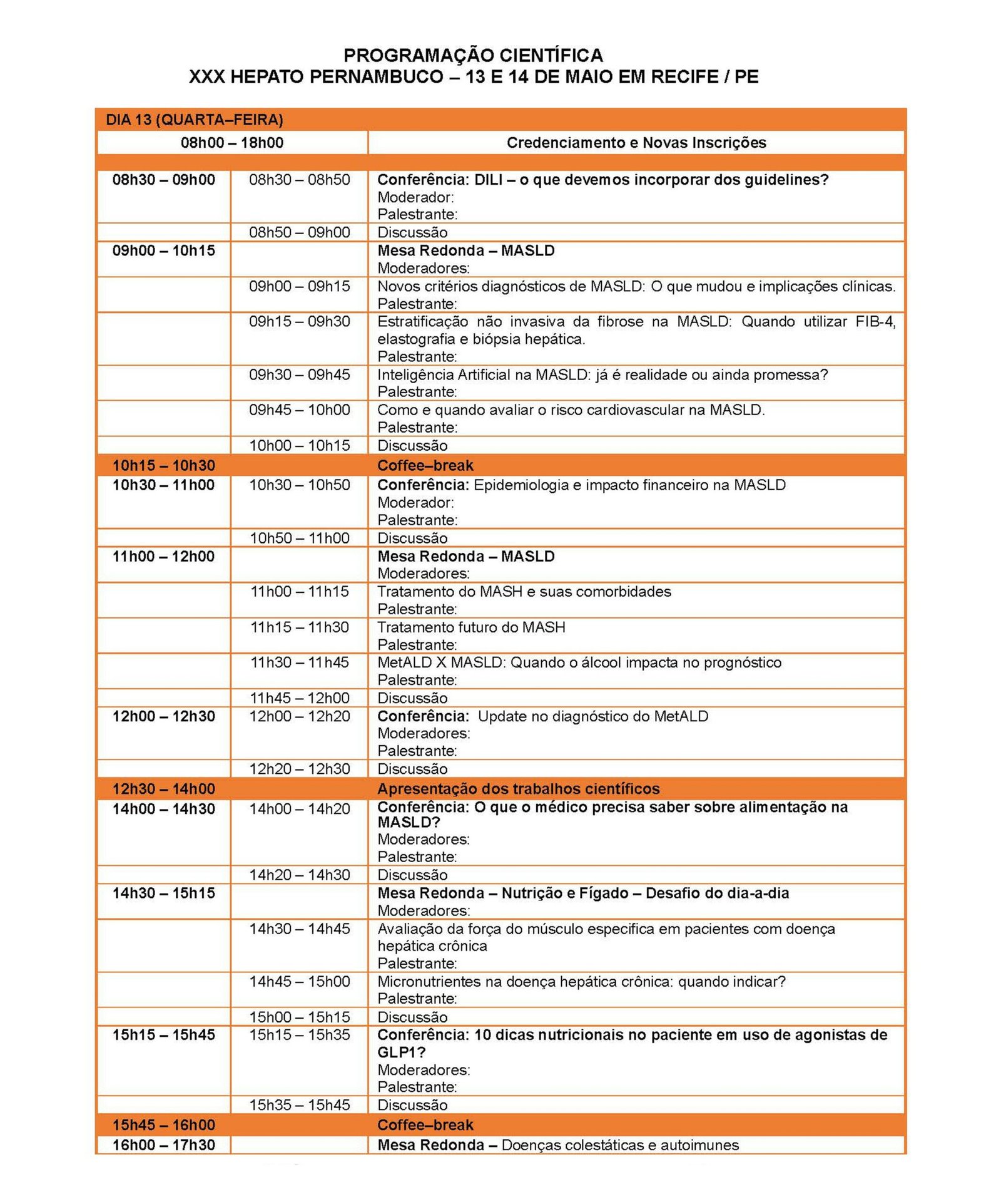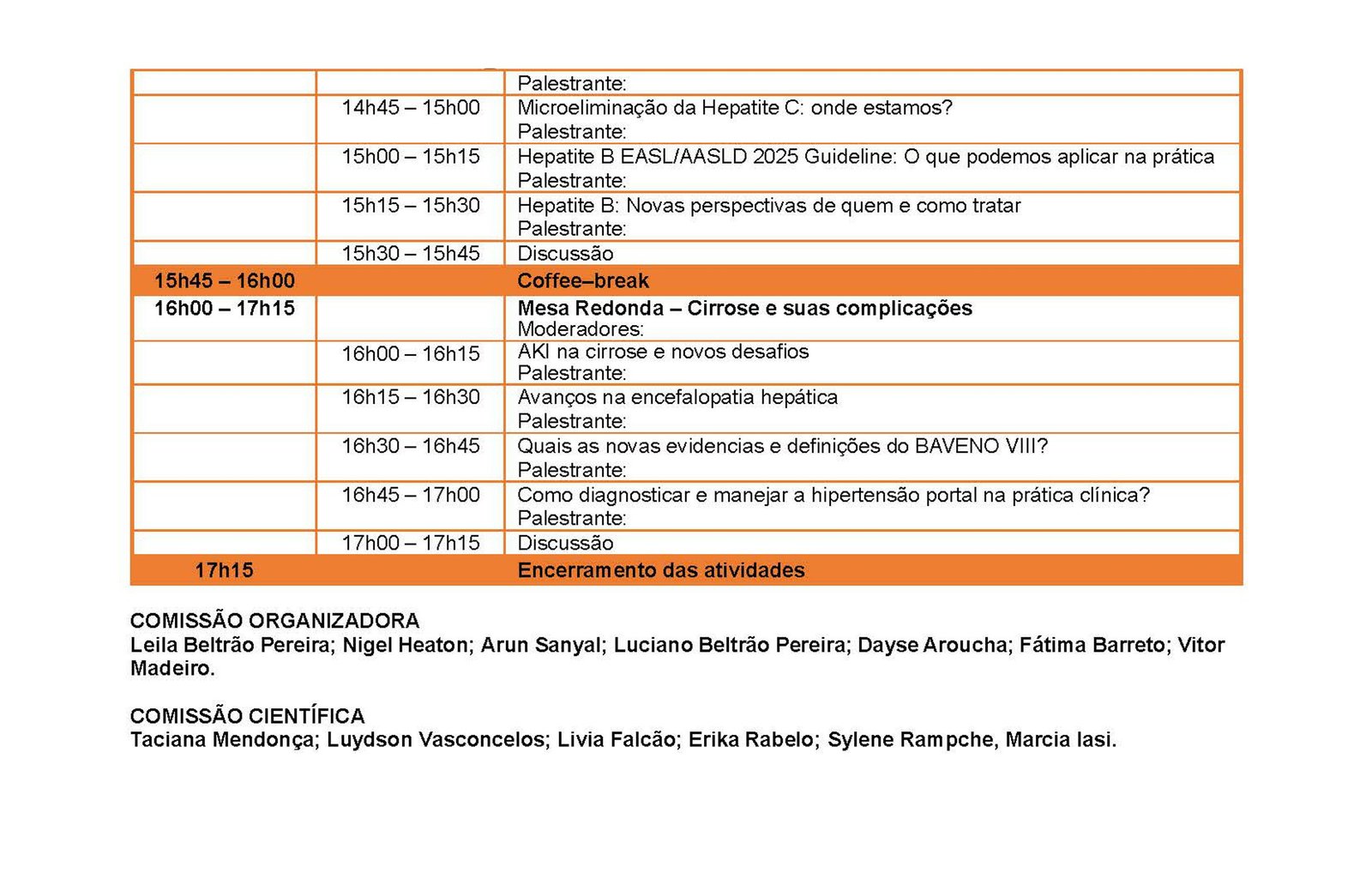 Como todos os anos contaremos com a participação de palestrantes internacionais e nacionais com expertise nos temas abordados. A programação está sendo elaborada pela Comissão Científica e enviada brevemente. Serão abordados temas como: hepatites virais, carcinoma hepatocelular, transplante hepático, hipertensão portal, doenças raras e doença hepática gordurosa não alcoólica.
